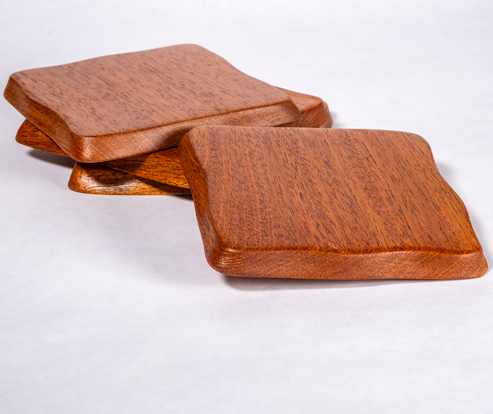 These coasters are made from premium hardwoods (Mahogany, Walnut, Cherry, and Maple), and are crafted to simulate a natural edge.  They are a perfect addition to a side or coffee table.  Each one is finished with a water based acrylic in order to resist water and show the beautiful wood grain.  These coasters come in a set of four, with each coaster measuring about 4″ x 4″ x 3/8″.